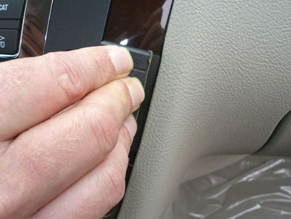 Peel off the cover of the adhesive tape on Part 1. Press the angled edge firmly into the gap between the center console panel frame and the console edge.