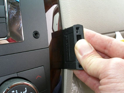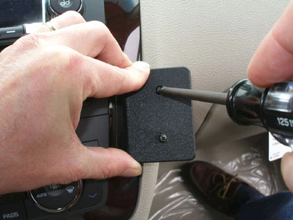 Press a screwdriver (Philips) firmly through the predrilled holes in Part 2 to open them up. Peel off the cover of the adhesive tape on Part 2. Place Part 2 onto Part 1 so the holes match and the adhesive tape on Part 2 is on the left side. Do not attach the tape to the center console panel frame yet. Screw Part 2 onto Part 1 using the enclosed screws. Right before you tighten the screws press the ProClip to the right with your thumb and index finger for optimal adjustment of the mount. Hold it in that position and tighten the screws.