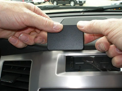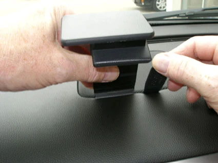 Peel off the cover of adhesive tape on the ProClip. Press the thin end of the enclosed gap opener into the gap between the speaker grill and the dashboard, to widen the gap. Press the curved edge on the ProClip into the gap next to the gap opener. Pull out the gap opener.