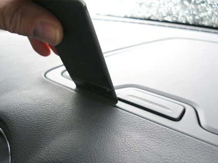 Press the thin end of the enclosed gap opener into the gap between the trim and the dashboard, to widen the gap. Peel off the adhesive tape covers on the ProClip.