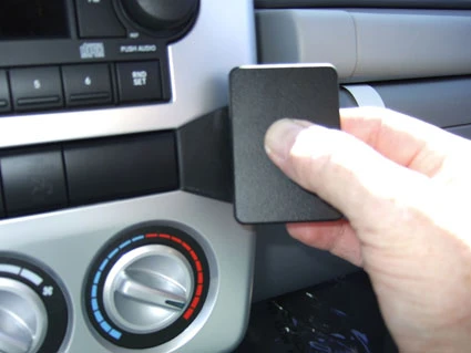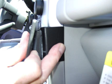 Peel off the cover of adhesive tape on the ProClip. Press the angled edge on the right side of the ProClip into the gap in the center console sidewall.