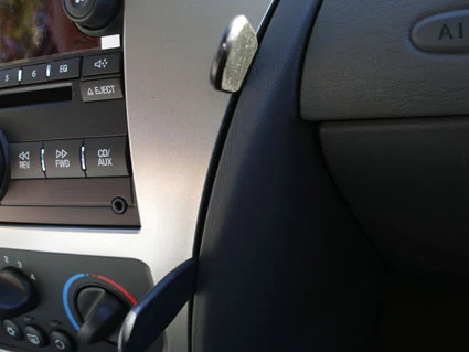 Place the angled edge of Part 1 against the gap above the opener. Press the angled edge firmly into the gap and at the same time bend Part 1 to the right until you see or hear/feel it snaps into place, and the adhesive tape attaches to the console edge.