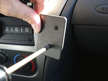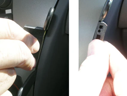 Press a screwdriver (Philips) firmly through the predrilled holes in Part 2 to open them up. Peel off the cover of the adhesive tape on Part 2. Place Part 2 onto Part 1 so the holes match and the adhesive tape on Part 2 is on the left side. Do not attach the tape to the center console panel frame yet. Screw Part 2 onto Part 1 using the enclosed screws. Right before you tighten the screws press the ProClip to the right with your thumb for optimal adjustment of the mount. Hold it in that position and tighten the screws.