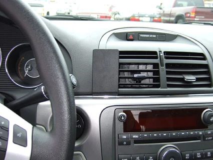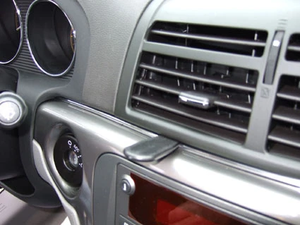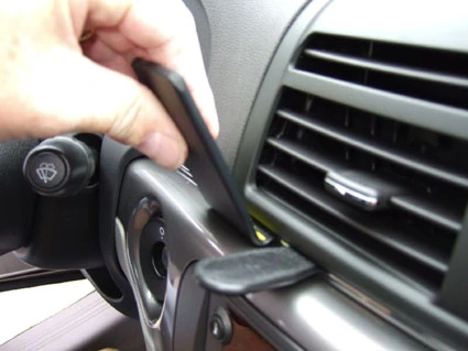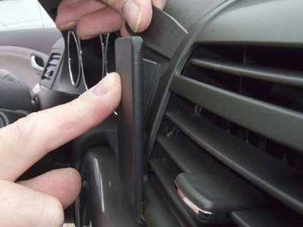 Press the gap opener into the gap between the air vent panel frame and the dashboard. Press firmly forward on the left side of the ProClip so the thin grooved edge goes into the gap below the gap opener. Press until you see or hear/feel it snaps into place. Pull out the gap opener.