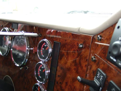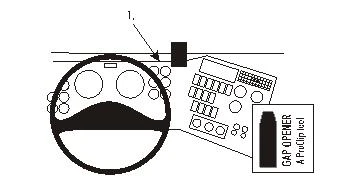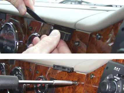Press the thin end of the enclosed gap opener into the gap between the dashboard edge and the center panel. Bend the panel slightly towards you using the gap opener. Place the angled edge of Part 1 against the gap next to the opener. Press the angled edge firmly into the gap and at the same time bend Part 1 upwards until you see or hear/feel it snaps into place and the adhesive tape attaches to the dashboard edge. Part 1 is in place. Tighten both screws in the center panel.
