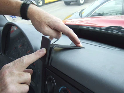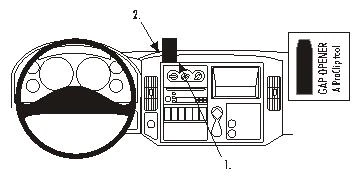 Press the thin end of the enclosed gap opener into the gap in the dashboard, to widen it. Peel off the cover of adhesive tape on the ProClip.