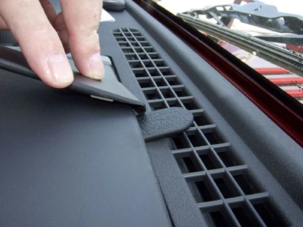Press the thin end of the enclosed gap opener into the gap between the air vent and the dashboard, to widen the gap. Peel off the cover of adhesive tape on the ProClip. Place the angled edge on the ProClip on top of the gap opener. Slide the ProClip into the gap to the left of the gap opener.