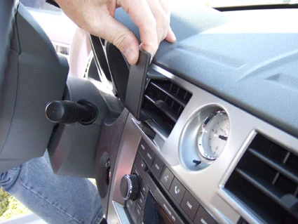 Peel off the cover of adhesive tape on the ProClip. Press the thin angled edge on the lower part of the ProClip into the gap between the air vent and the surrounding panel frame.