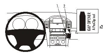 Press the thin end of the enclosed gap openers into the gap between the control panel and the dashboard, to widen the gap. Peel off the adhesive tape covers on the ProClip. Use the enclosed alcohol pad to clean the area where the ProClip is to be installed.