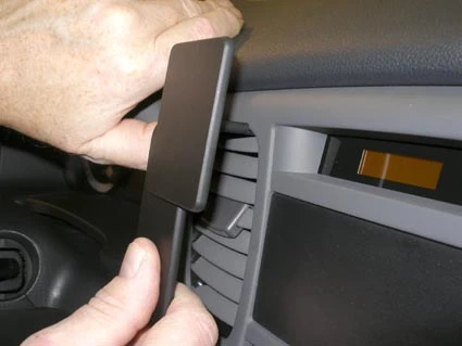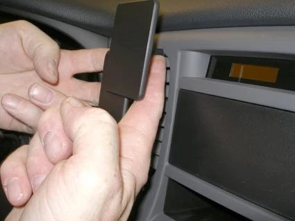 Press the lower part of the ProClip forward and hook the grooved lower edge over the lower edge of the air vent. Place your fingers inside the ProClip and press downward so the grooved edge hooks properly into place.