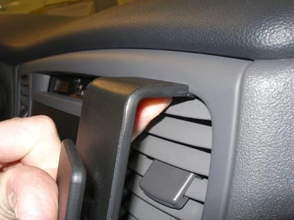 Press the lower part of the ProClip forward and hook the grooved lower edge over the lower edge of the air vent. Place your fingers inside the ProClip and press downward so the grooved edge hooks properly into place.