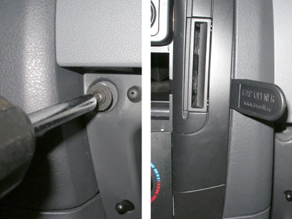 Open the glove compartment. Remove the screw in the upper left corner. Press the thin end of the enclosed gap opener into the gap between the frame surrounding the control panel and the dashboard, to widen the gap. Peel off the cover of the adhesive tape on the ProClip.