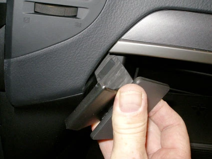 Open the glove compartment. Press the thin end of the enclosed gap opener into the gap between the frame surrounding the air vent and the control panel, to widen the gap. Peel off the adhesive tape covers on the ProClip. Press the angled edge on the right part of the ProClip into the gap between the glove compartment and the dashboard.