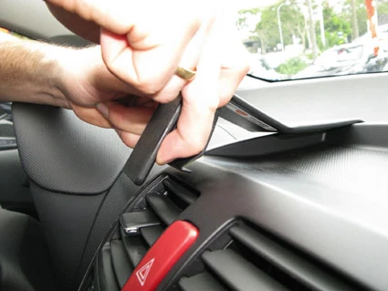 Use the enlcosed alcohol pad to clean the area where the ProClip is to be installed. Peel off the adheisve tape covers on the ProClip. Place the angled edge on the upper part of the ProClip onto the dashboard next to the center console. Press down on top of the ProClip, in the same time pull it toward you so the angled upper edge hooks into the gap between the dashboard and the center console.