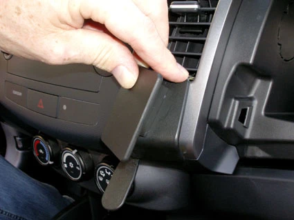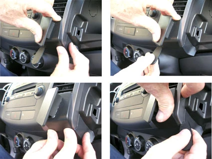 Prize the gap slightly wider using the gap opener, in the same time press the left side of the angled edge on the lower part of the ProClip into the gap next to the gap opener. Pull out the gap opener and press it into the gap by the console corner, in the same time press forward on the right side of the lower part of the ProClip so the angled edge goes all the way into the gap. Pull out the gap opener. Press upward on the lower edge of the ProClip so it is properly in place.