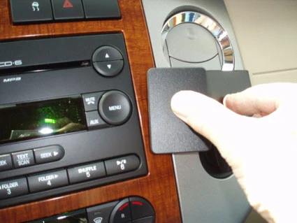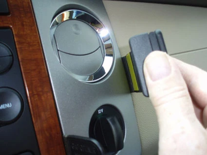 Press the thin end of the enclosed gap opener into the gap between the two dashboard sections, to widen it. Peel off the cover of adhesive tape on the ProClip.