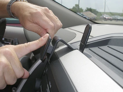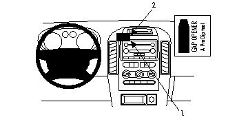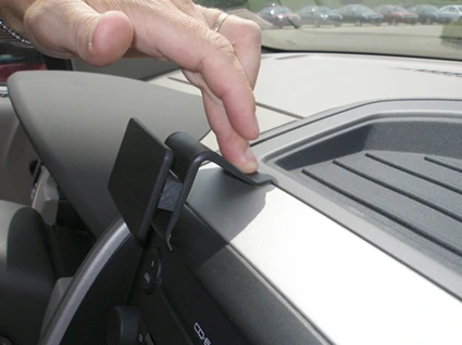 Press the thin end of the enclosed gap opener into the gap between the tray and the dashboard, to widen it. Peel off the cover of adhesive tape on the ProClip. Hook the angled edge on the lower part of the ProClip around the panel frame surrounding the stereo.