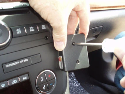 Press a screwdriver (Philips) firmly through the predrilled holes in Part 2 to open them up. Peel off the cover of the adhesive tape on Part 2. Place Part 2 onto Part 1 so the holes match and the adhesive tape on Part 2 is on the left side. Do not attach the tape to the center console panel frame yet. Screw Part 2 onto Part 1 using the enclosed screws. Right before you tighten the screws press the ProClip to the right with your thumb for optimal adjustment of the mount. Hold it in that position and tighten the screws.