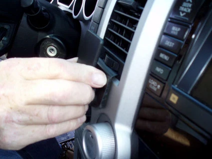 Peel off the cover of adhesive tape on the ProClip. Hook the curved edge on the top of the ProClip over the air vent edge.