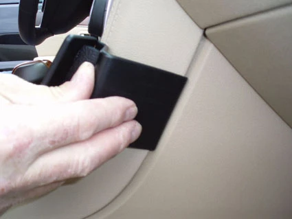 Peel off the cover of adhesive tape on the ProClip. Hook the angled edge on the left side of the ProClip around the center console edge.