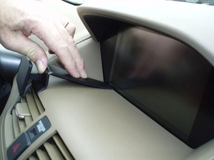 Press firmly forward on the upper part of the ProClip (behind the face plate) so the angled edge goes into the gap between the dashboard ledge and the information window. Press until you see or hear/feel it snaps into place.