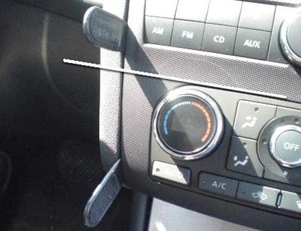 Align the top of Part 1 with the panel line above the temperature controls (see white line in the photo). Press the angled edges of Part 1 into the gap, at the same time bend Part 1 to the left until you see or hear/feel it snaps into place. Slide Part 1 downwards until it stops. Press Part 1 towards the console edge so the adhesive tape attaches. Pull out the gap openers.