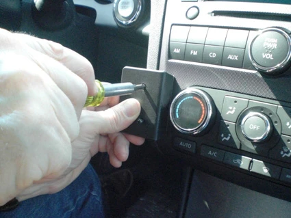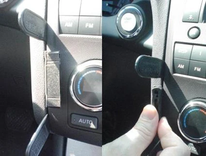 Use the enclosed alcohol pad to clean the area where the ProClip is to be installed. Press the thin end of the enclosed gap openers into the gap between the center console panel frame and the dashboard, to widen the gap. Peel off the cover of the adhesive tape on Part 1.