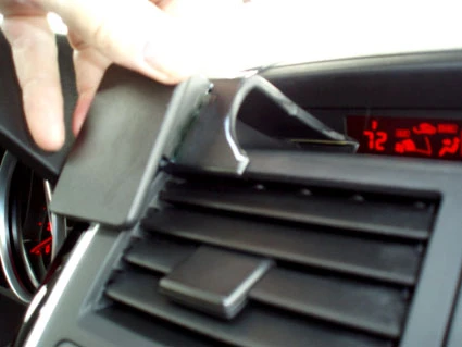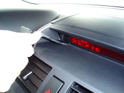 Press firmly forward on the upper part of the ProClip (behind the face plate) so the angled edge goes into the gap between the dashboard ledge and the information window. Press until you see or hear/feel it snaps into place.