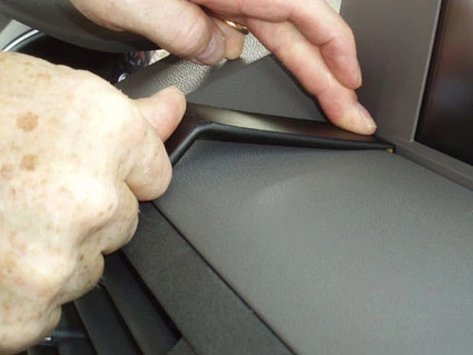Press firmly forward on the upper part of the ProClip (behind the face plate) and at the same time, press down on the end of the ProClip so the angled edge goes into the gap between the dashboard ledge and the trim around the display. Press until you see or hear/feel it snaps into place.