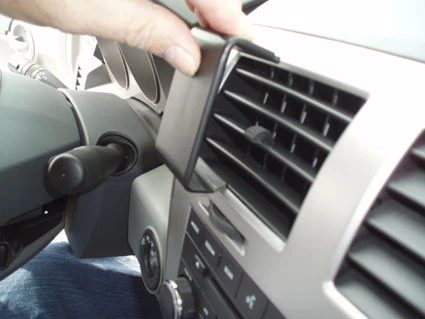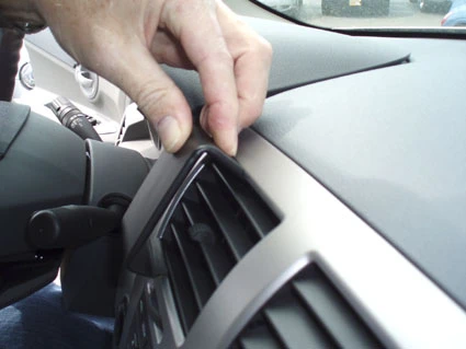 Press firmly down on top of the ProClip and at the same time insert the grooved edge into the air vent. Then let go of the pressure so the grooved edge hooks onto the upper air vent edge.