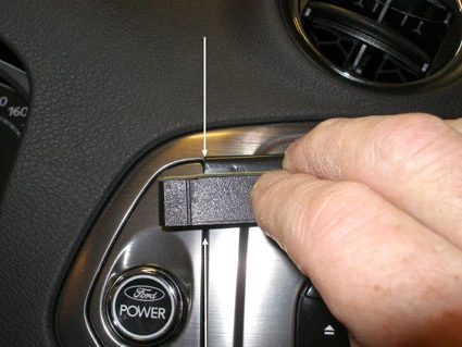Press the angled edge on Part 1 into the gap between the frame surrounding the control panel and the dashboard. Press Part 1 forward/upward so the angled edge hooks behind the frame surrounding the control panel and the adhesive tape attaches to the dashboard.