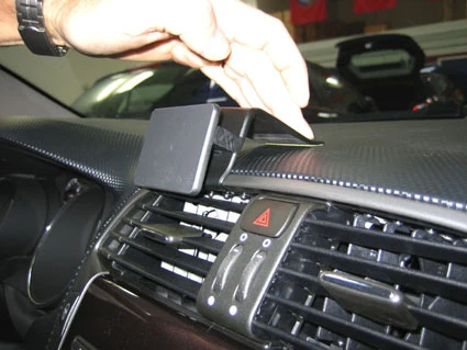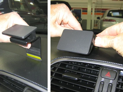 Peel off the adhesive tape covers on the ProClip. Press the curved edge on the upper part of the ProClip into the gap on top of the dashboard. Flip the ProClip toward you/downward so the curved edge hooks into the gap.