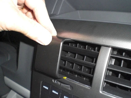 Peel off the cover of adhesive tape on the ProClip. Place the angled edge on the lower part of the ProClip into the gap/seem between the air vent and the air vent edge.