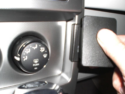 Press firmly forward on the face plate so the angled edge on the right side of the ProClip snaps into the gap between the console edge trim and the glove compartment frame. If the gap is tight, use the thin end of the enclosed gap opener to widen the gap below the ProClip.