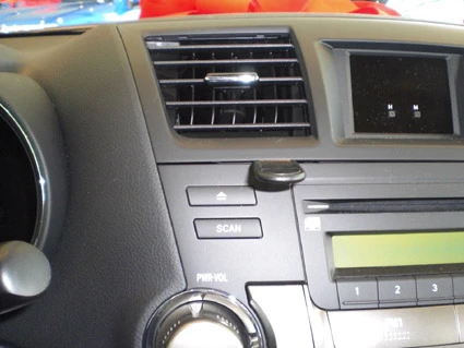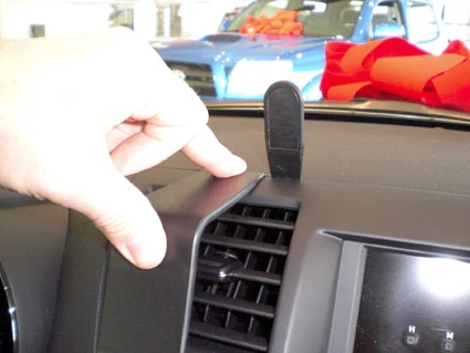 Press the gap opener into the gap between the air vent panel frame and the top of the dashboard. Press forward on the upper part of the ProClip, with your thumb or one hand, so the ProClip flexes forward and meets the gap next to the gap opener. Then press firmly down on top of the ProClip, with you finger or other hand, so the angled edge goes into the gap. Press until you see or hear/feel it click into place. Pull out the gap opener.