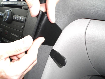 Press the thin end of the enclosed gap opener into the gap between the console edge and console sidewall, to widen it. Peel off the cover of adhesive tape on the ProClip. Hook/press the angled edge on the right side of the ProClip into the gap next to the gap opener. Pull out the gap opener.