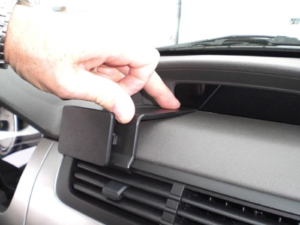 Place your thumb onto the upper part of the ProClip (behind the face plate). Push firmly forward on the ProClip so the angled edge on the back part of the ProClip snaps around the panel edge surrounding the information window. Press down on top of the ProClip with your finger to make sure the angled edge is properly hooked around the panel edge, and for best possible attachment of the adhesive tape.