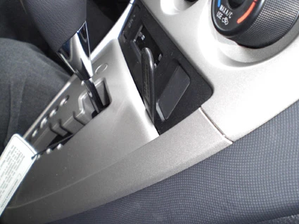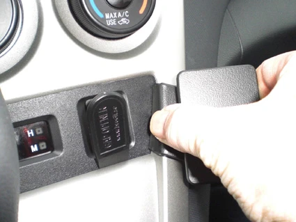 Press the thin end of the enclosed gap opener firmly into the gap between the dark panel and the surrounding center console panel, to widen the gap. Peel off the cover of adhesive tape on the ProClip.