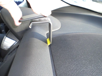 Peel off the cover of adhesive tape on the ProClip. Hold the ProClip in a 90 degree position and press the curved edge into the gap between the dashboard top and the dashboard edge.