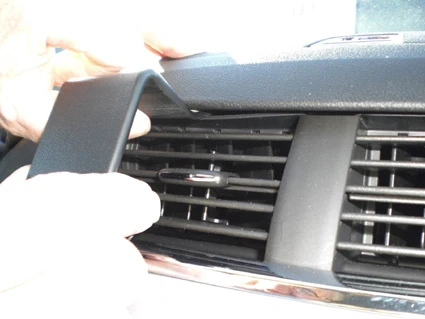 Peel off the cover of adhesive tape on the ProClip. Press the thin edge on the top of the ProClip into the gap between the upper part of the air vent and the padded top of the dashboard.