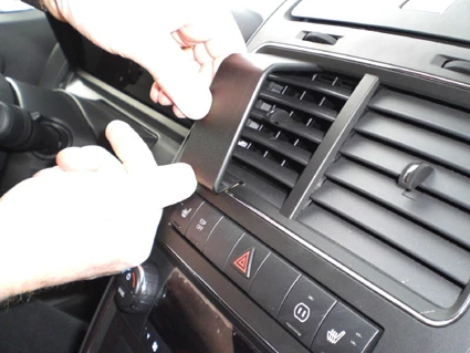 Press upward and forward on the lower part of the ProClip so the angled edge hooks into the gap/seem between the air vent and the air vent edge.
