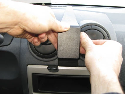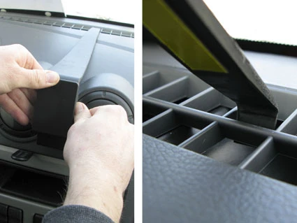 Press the thin end of the enclosed gap opener into the gap between the frame surrounding the control panel and the dashboard, to widen the gap. Peel off the adhesive tape covers on the ProClip. Place the ProClip between the air vents. Hook the angled edge on the upper part of the ProClip into the air vent by the windscreen.