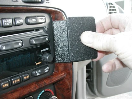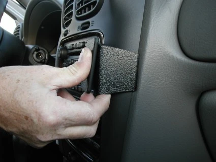 Peel off the cover of the adhesive tape on the ProClip. Press the curved edge on the left side of the ProClip into the gap between the stereo and the surrounding panel frame. Press until you see or hear/feel it snaps into place.