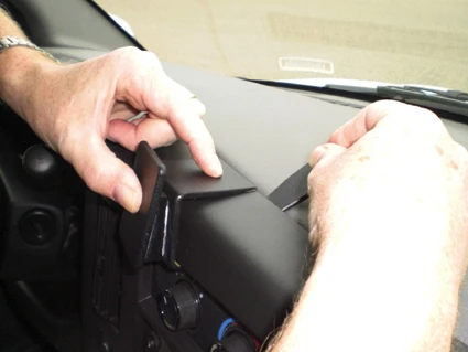 Press the gap opener into the gap between the center console panel frame and dashboard. Press firmly forward on the upper part of the ProClip so the angled edge goes into the gap next to the gap opener. Press down on top of the ProClip to make sure the angled edge is all the way into the gap. Pull out the gap opener.
