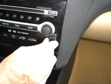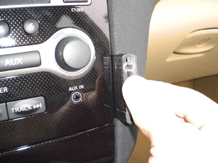 Press the thin edge firmly into the gap and at the same time: bend Part 1 to the right until you see or hear/feel it click into place. The adhesive tape will attach to the console edge.