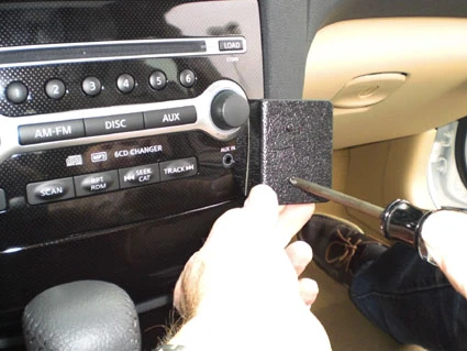Press a screwdriver (Philips) firmly through the predrilled holes in Part 2 to open them up. Peel off the cover of the adhesive tape on Part 2. Place Part 2 onto Part 1 so the holes match and the adhesive tape on Part 2 is on the left side. Do not press the tape to the center console panel frame yet. Screw Part 2 onto Part 1 using the enclosed screws. Right before you tighten the screws press the ProClip to the right with your thumb for optimal adjustment of the mount. Then press the adhesive tape on the left side of Part 2 to the center panel. Hold the ProClip in that position and tighten the screws.