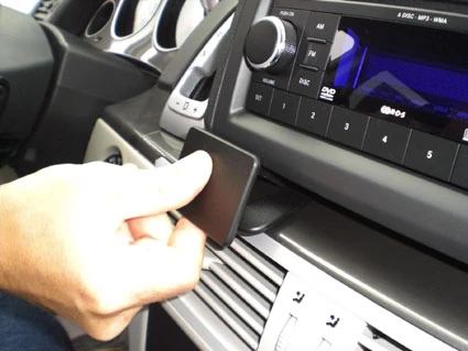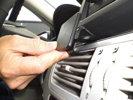 Press the thin end of the enclosed gap opener into the gap between the air vent ledge and the dashboard overhang, to widen the gap. Peel off the cover of adhesive tape on the ProClip.