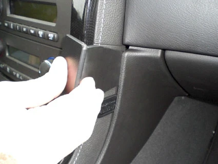 Press the thin end of the enclosed gap opener into the seam/gap in the console sidewall, to widen the gap. Peel off the cover of adhesive tape on the ProClip.