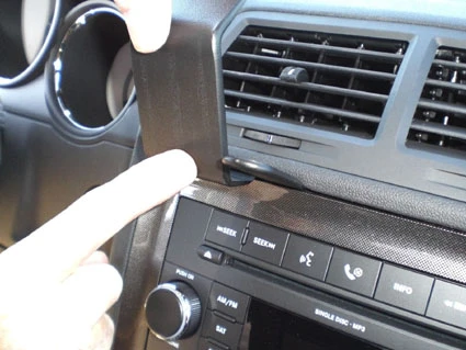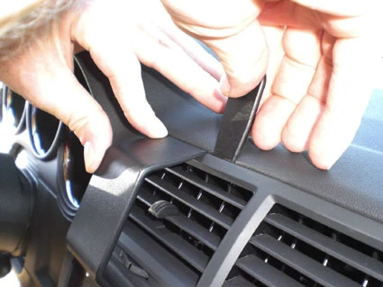 Press the gap opener into the gap between the air vent and the padded dashboard. Hold the gap opener in this position and press down on top of the ProClip so the angled edge goes into the gap next to the gap opener. Press down on the right side first and then on the left side so the angled edge goes all the way into the gap. Pull out the gap opener.