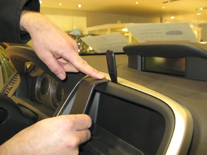 Use the enclosed alcohol pad to clean the area where the ProClip is to be installed. Press the thin end of the enclosed gap opener into the gap between the frame surrounding the display and the frame surrounding the center console. Peel off the adhesive tape cover on the ProClip. Hook the angled edge on the upper part of the ProClip into the gap next to the gap opener and press it all the way into the gap. Pull out the gap opener.